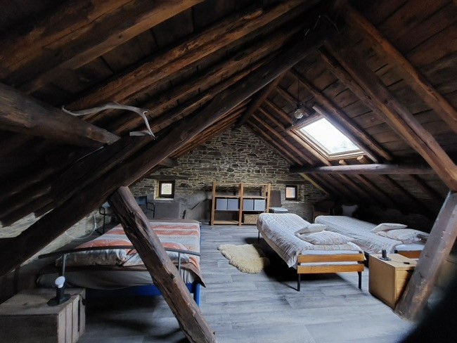 Op de eerste verdieping bevinden zich twee comfortabele slaapkamers, elk ingericht met een tweepersoonsbed. Op de zolderverdieping zijn nog eens twee eenpersoonsbedden en een extra tweepersoonsbed aanwezig. Hierdoor is de accommodatie zeer geschikt voor grotere gezelschappen of gezinnen die willen genieten van een vakantie met paard in de natuur. Voor de allerkleinsten is er desgewenst een kinderbedje beschikbaar.