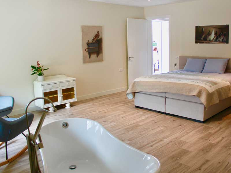 Er zijn 3 ruime gastenkamers van +/- 35 m2 tot 45 m2 groot. 2 kamers voor 2 personen, en 1 kamer voor 4 personen. Iedere kamer heeft een een groot kingsize bed en een eigen badkamer met stortdouche en een bad.