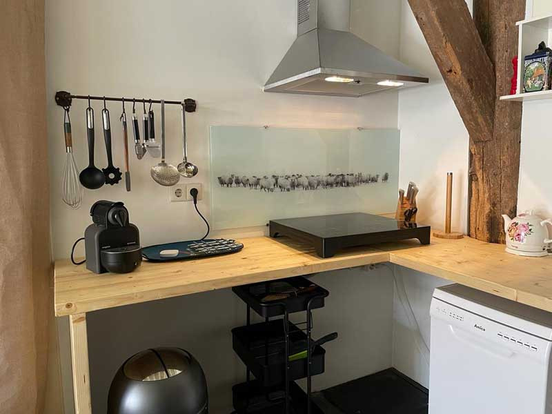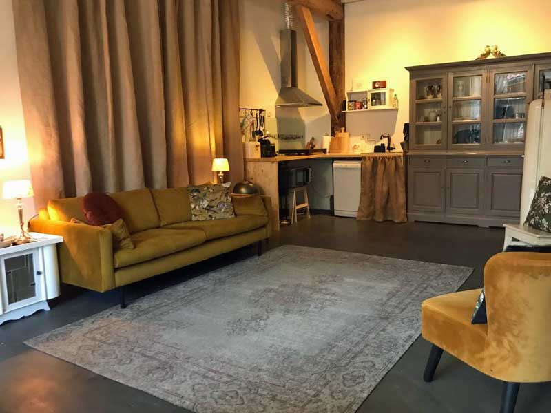 Een grote woonkamer met kitchenette (vier pits-inductieplaat, combi-oven, vaatwasser, SMEG-koelkast, servies, glaswerk, bestek, nespresso-machine, melkschuimer, hulpapparatuur)