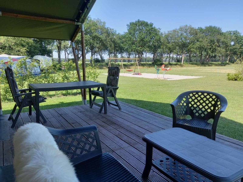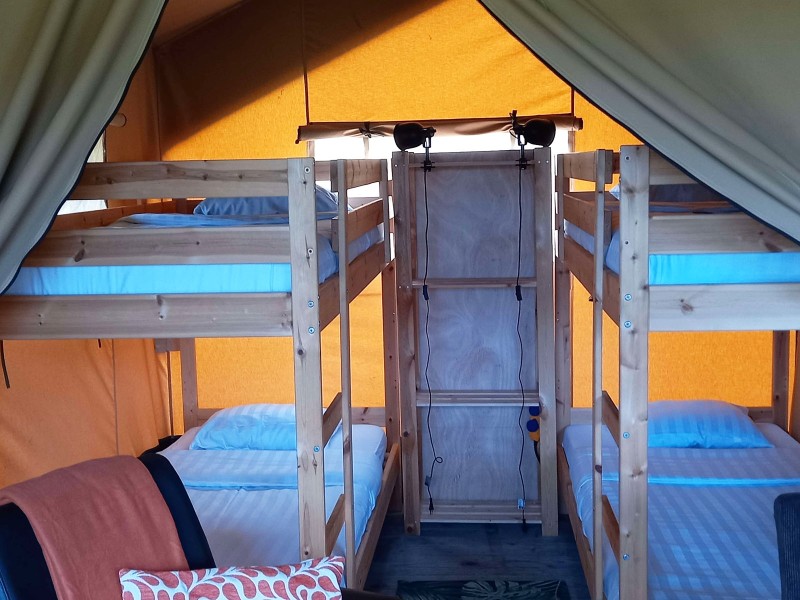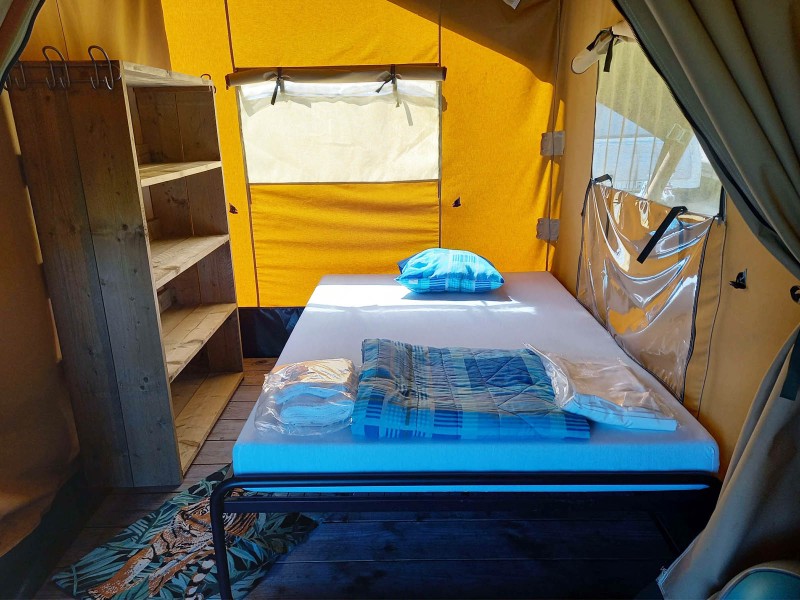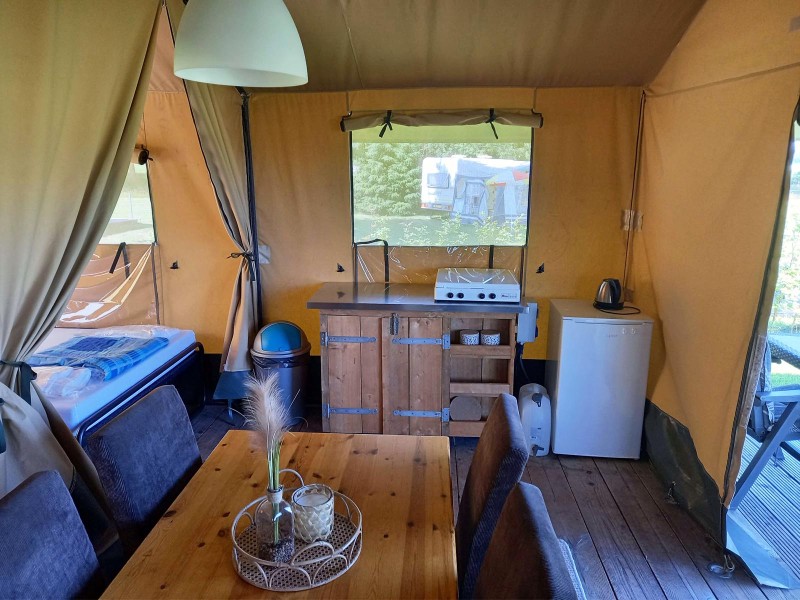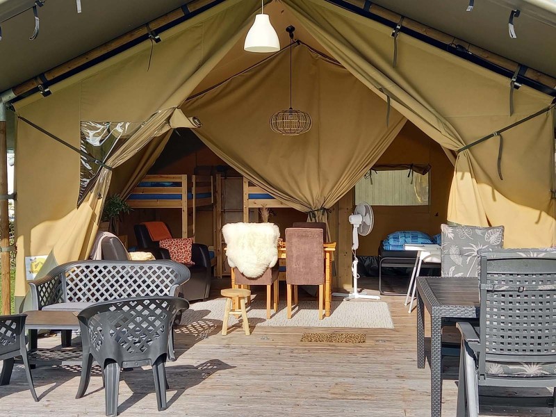In de safaritenten is een 2 persoonsbed en 2 stapelbedden. Ook een geheel ingerichte keuken met 4-pits gasfornuis. Naast de eettafel met stoelen, zijn er ook nog 2 comfortabele stoelen. Buiten de tent heb je je eigen terrasmeubilair. De Comfort Safaritenten hebben elk privésanitair in het Sanitairgebouw (op 5 meter afstand)