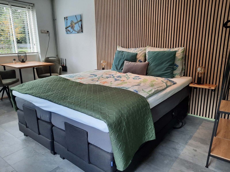 Het comfortabele gastenverblijf heeft beneden een 2-persoons boxspringbed, een eettafel en een keuken met o.a. gasfornuis, oven en koelkast. In de badkamer vind je een douche, wastafel en toilet. Boven is nog een eenpersoonsbed. De B&B heeft een eigen terras met uitzicht op de tuin en er is een afgesloten fietsenstalling waar je je elektrische fiets op kan laden. Eventueel zijn er gratis 2 fietsen beschikbaar.
