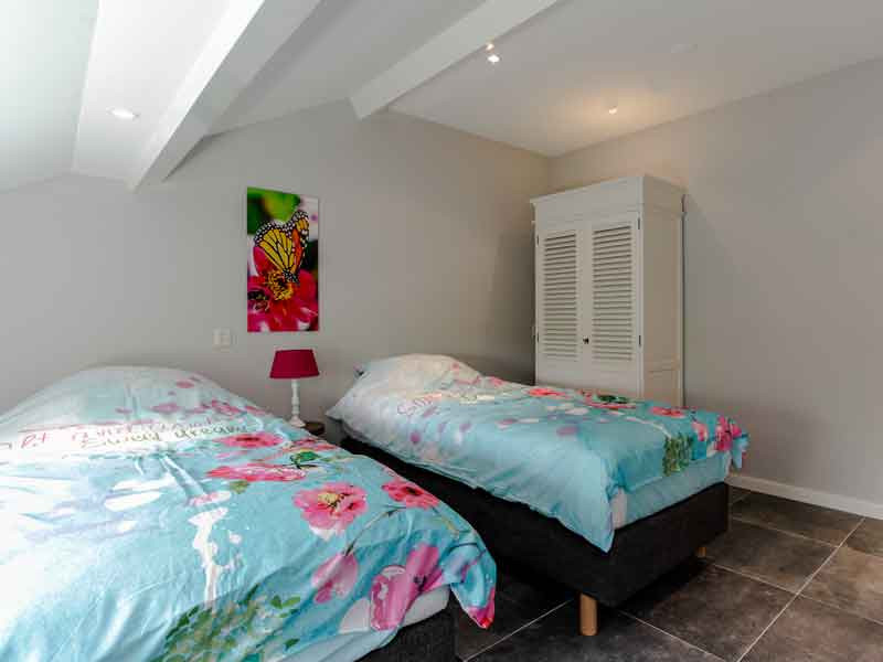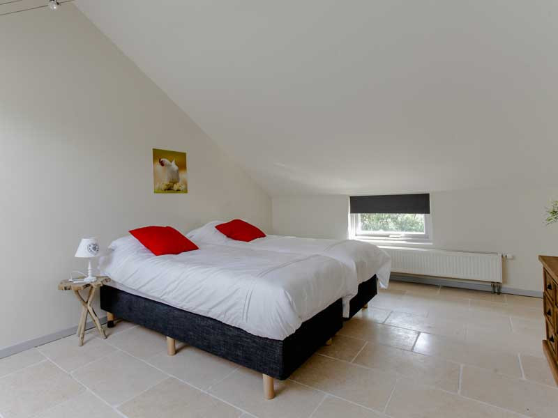 Huisje Bram is het voorste huisje. Het huisje heeft 2 verdiepingen met in totaal 3 slaapkamers; 1 beneden en 2 boven. In totaal zijn er 6 boxspringbedden en een babyledikant, voorzien van een goed matrasje. Alle bedden kunnen als eenpersoonsbed worden neergezet of als tweepersoonsbed. Verder is het huisje voorzien van een luxe inbouwkeuken met inbouwapparatuur. Er is een aparte wc op de benedenverdieping en de badkamer is voorzien van een luxe badkamermeubel en ruime inloopdouche. Het huisje heeft een afgesloten tuin.