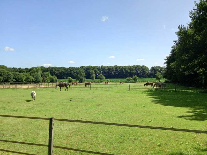 Voor je paard is er weidegang mogelijk, er zijn vijf weides beschikbaar, rondom afgezet met schriklint.
