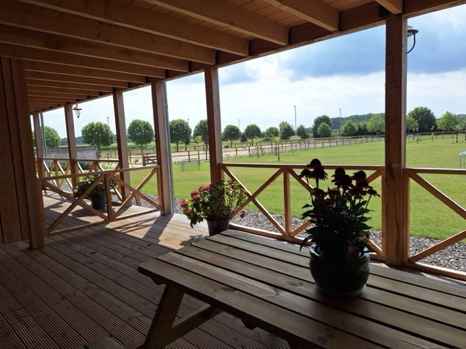 - Grote veranda met uitzicht over het parkje, paddocks en de paardenrijbak
